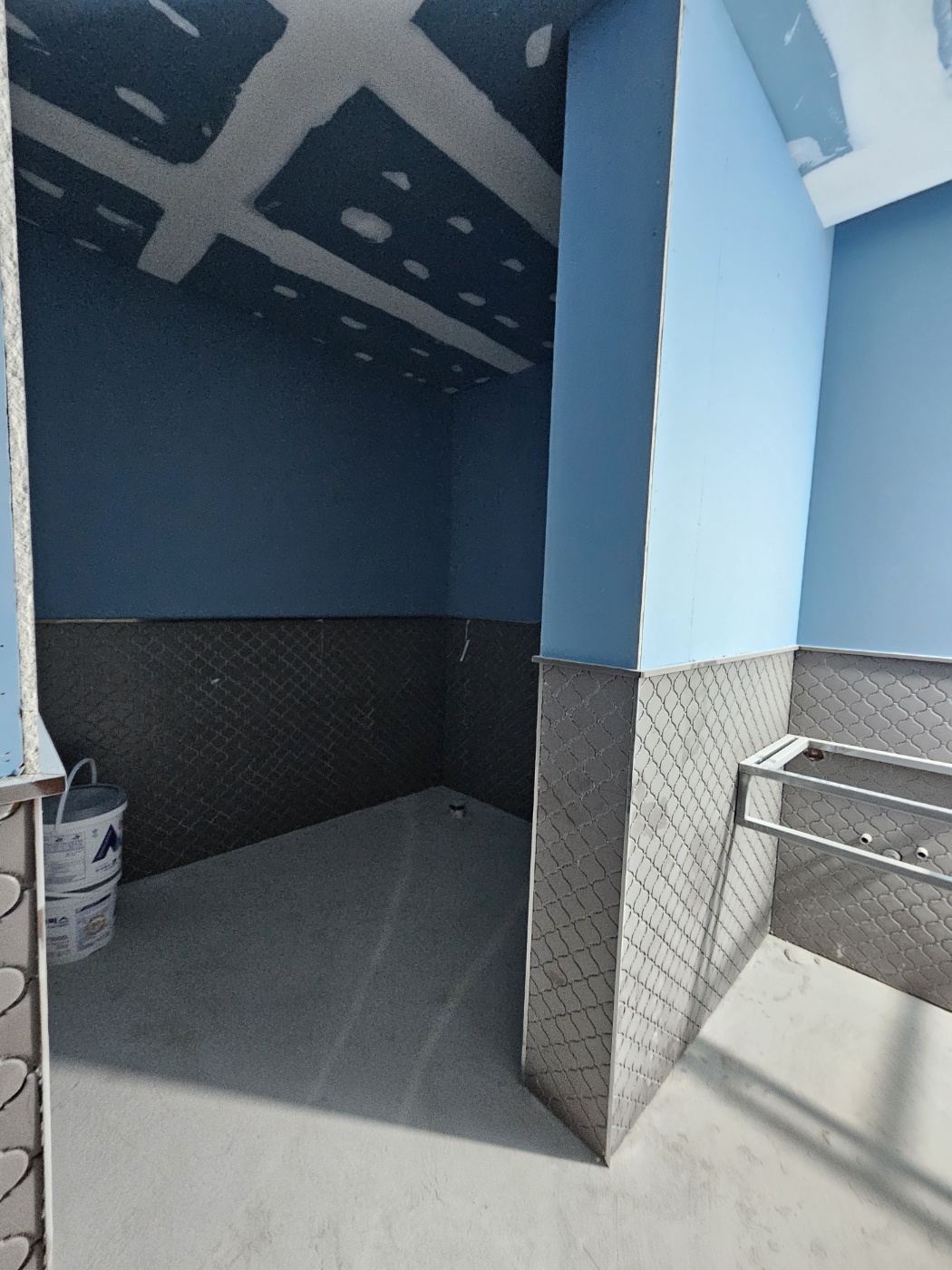 약속된 날짜에 베테랑 시공팀이 투입되었습니다. 현장은 바닥 타일 작업은 끝났으나, 벽면과 천장의 페인트 도장 공사가 일부 미흡한 상태였습니다.