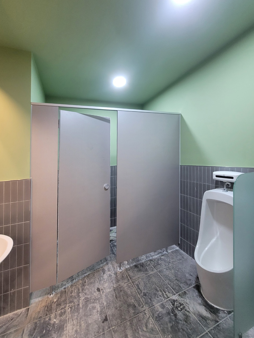 남자 화장실은 산뜻한 연두색 벽면과 차분한 그레이 세로 타일이 조합되어 청결하면서도 눈이 편안한 분위기였습니다.