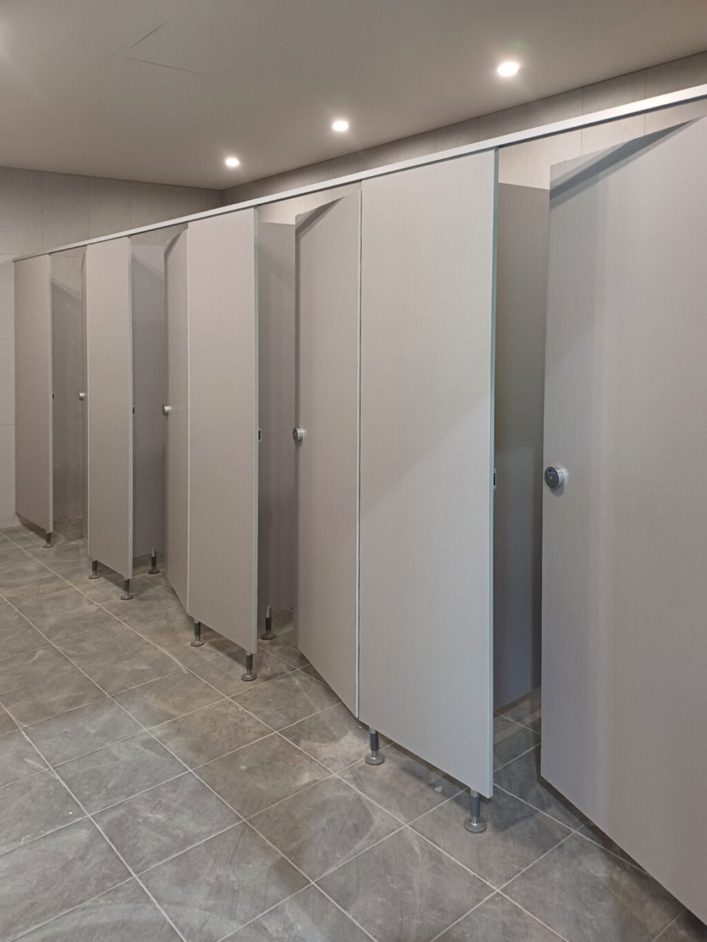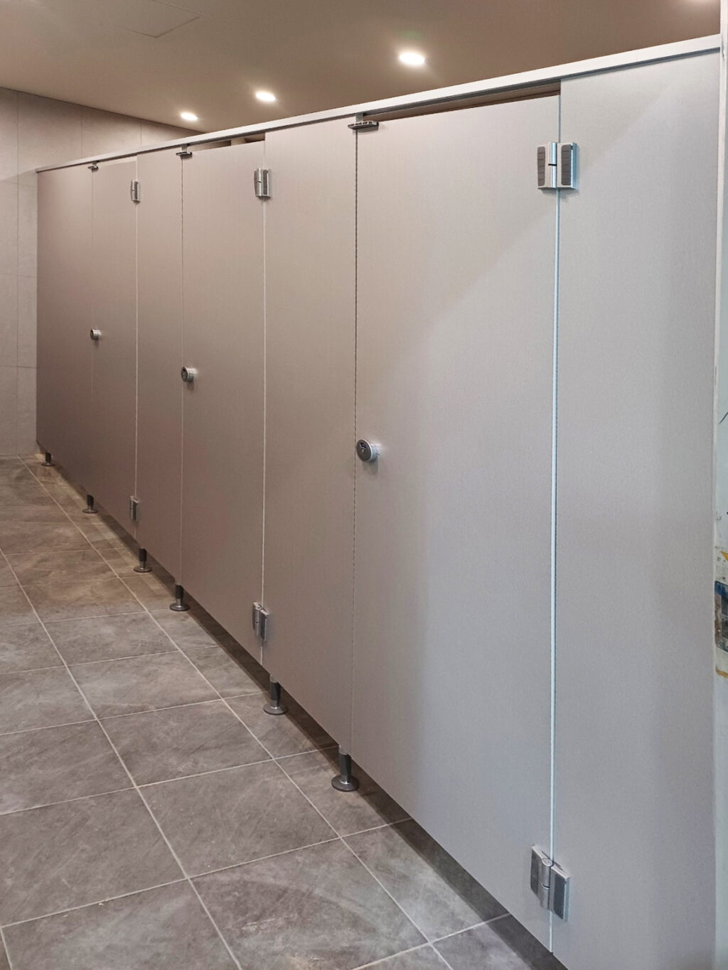 공간의 조화: 회색 헤어라인 큐비클이 타일 마감과 어우러져, 오래된 건물의 느낌을 지우고 세련되고 위생적인 공간으로 탈바꿈했습니다.