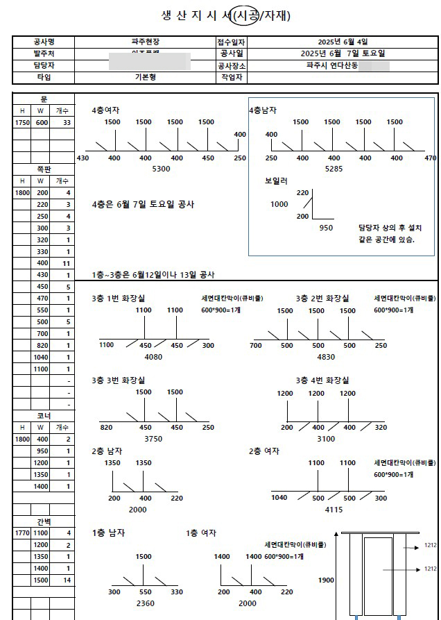 복귀 후 작성한 **생산 지시서(Shop Drawing)**는 단순한 도면이 아닙니다. 1차와 2차 설치 구간을 명확히 구분하고,